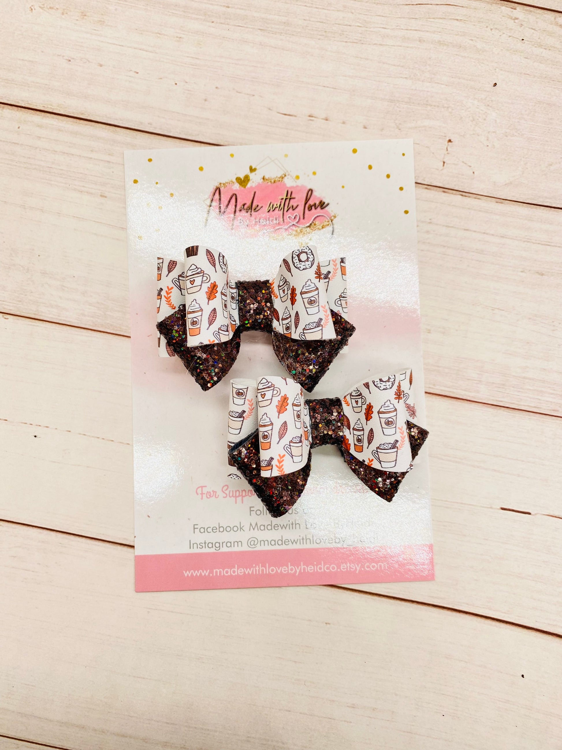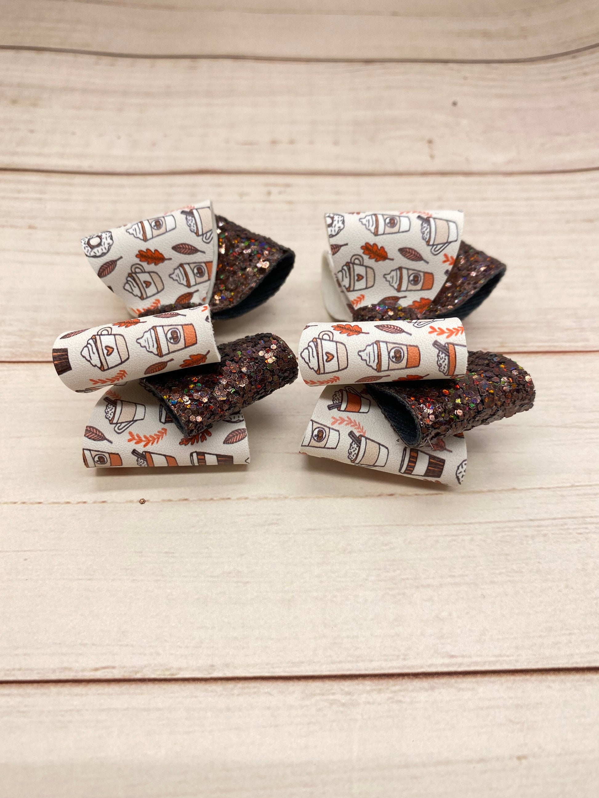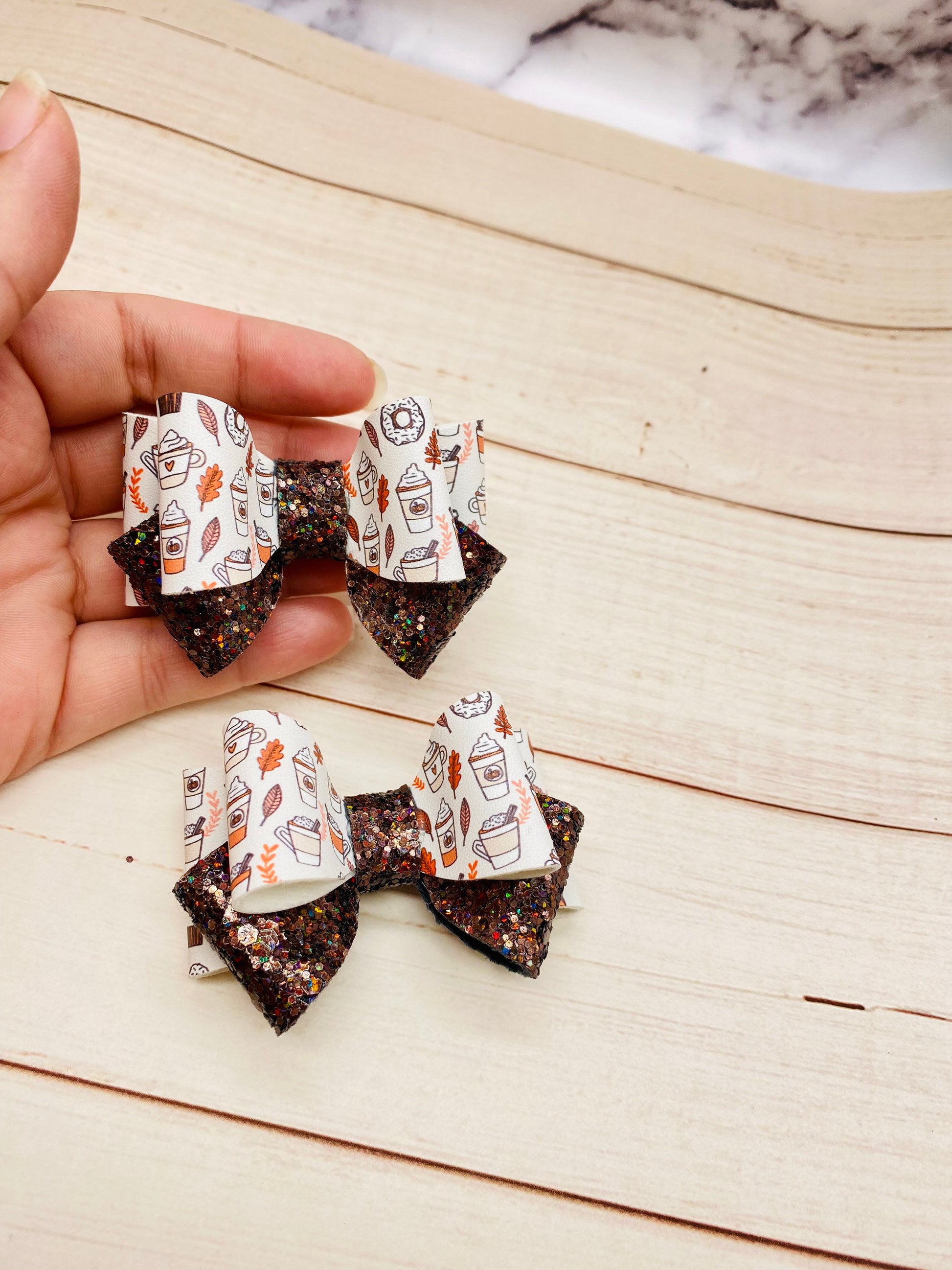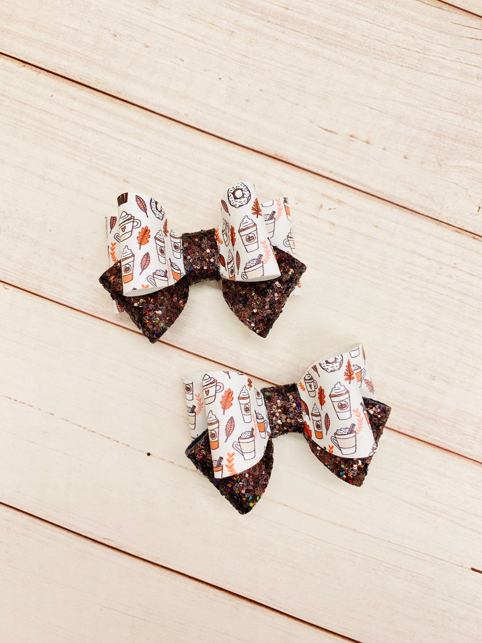 This bow has a beautiful pumpkin spice print and luxe chocolate glitter.