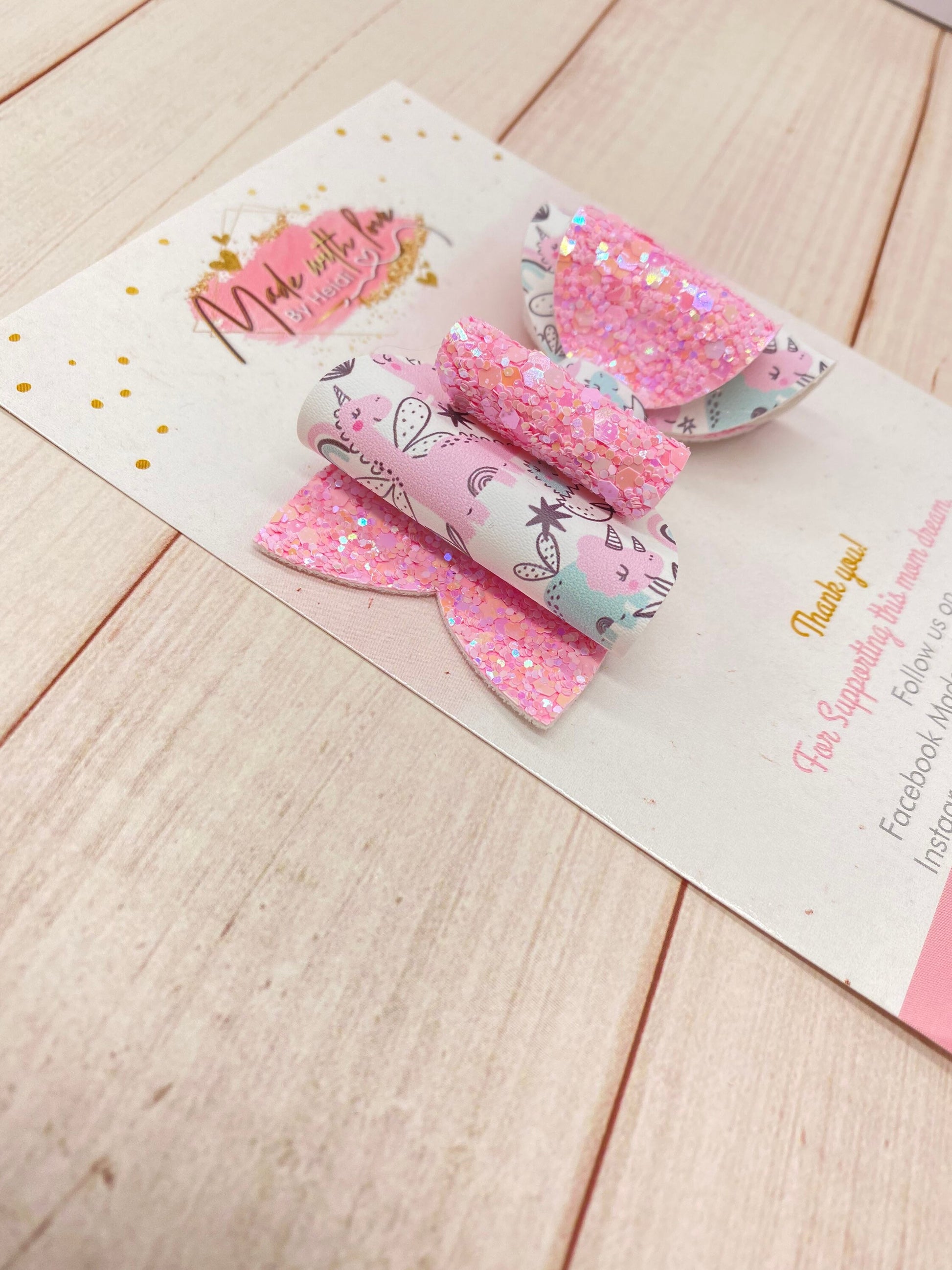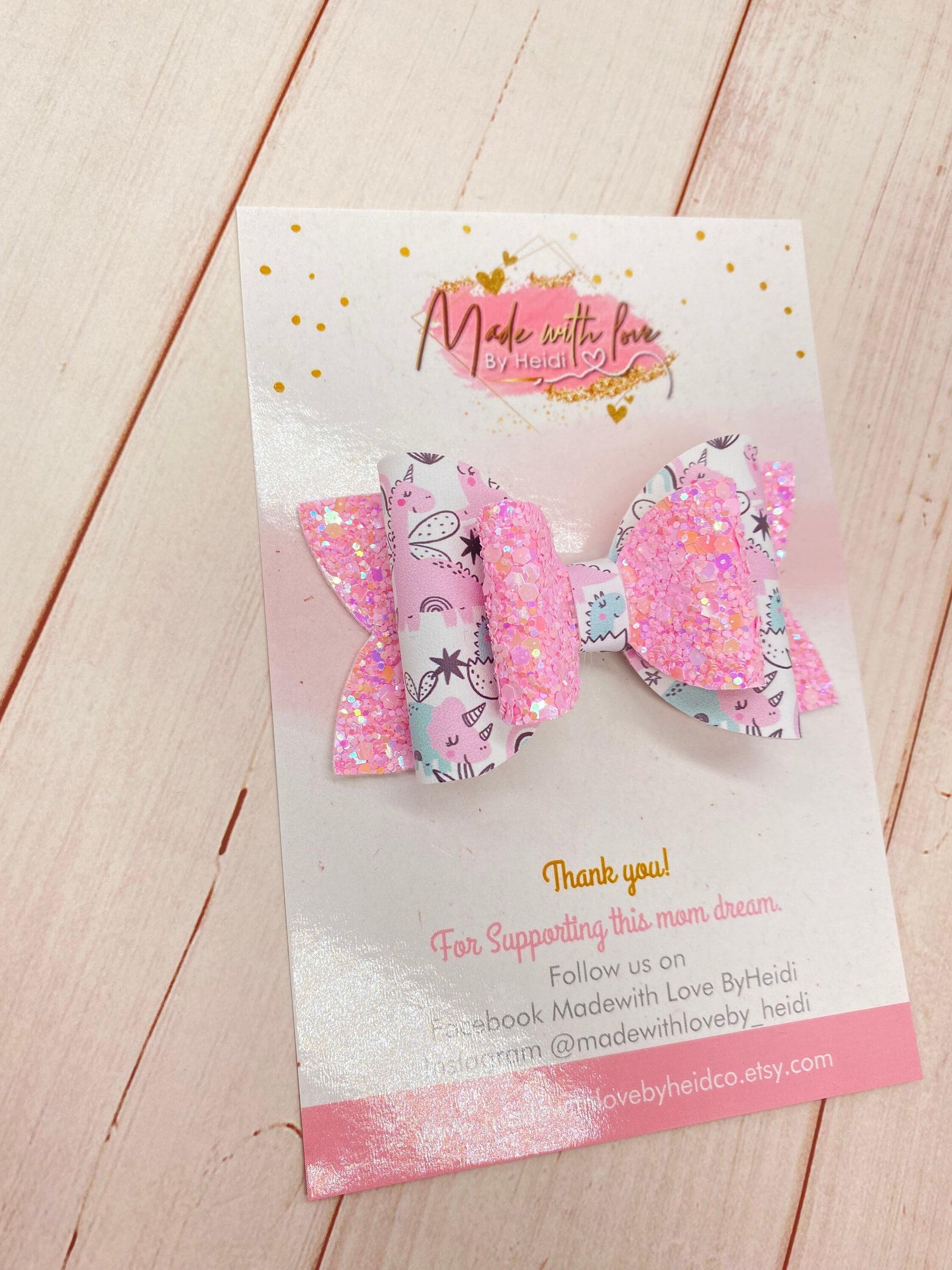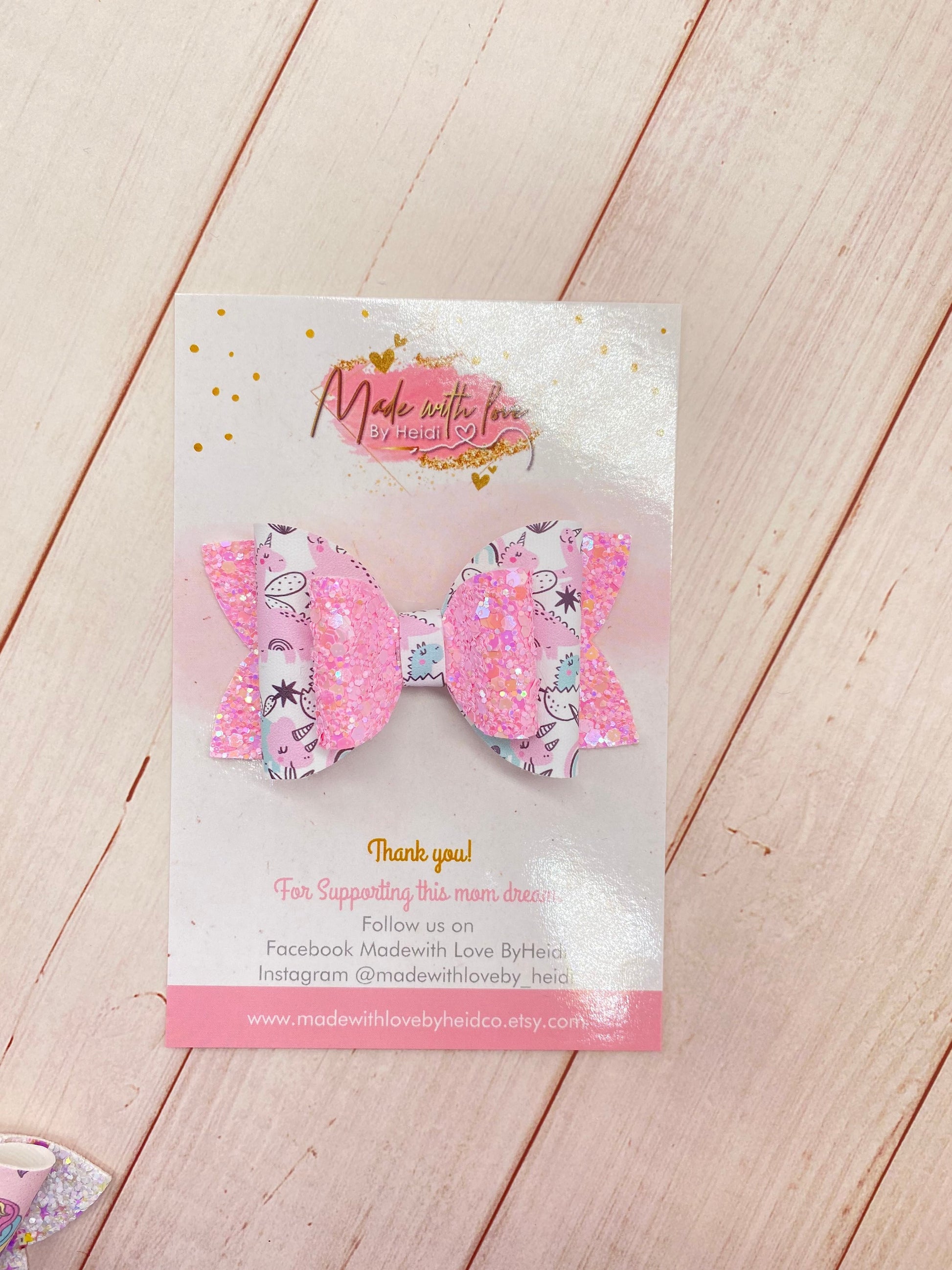 This hand made hair bow is made out of vegan leather and luxe glitter leather. This bow size is 3.5” wide. This product sell as show in the picture. We do not accept returns! In any of our products. All our products are hand made. Shipping -All our products are Ready to ship -You will get a tracking number - Vegan leather bow and Luxe glitter leather - Bows are the perfect accent for any outfit! - Neatly packaged, making them great baby shower, holiday, and birthday gifts! - Cleaning use a damp towel. Do not wash please! > Please, be safe! We highly suggest that you NEVER leave any child unattended with our products, as they do contain small pieces! Made from a pet free/smoke free home. All accessories are handmade by me with love and care. Please note color may differ slightly due to monitor variations. Contact me if you would like a custom set. We’d love to see your cutie making a statement with our bows. Tag and follow us on Instagram for new product announcements and promotions! @madewithloveby_heidi