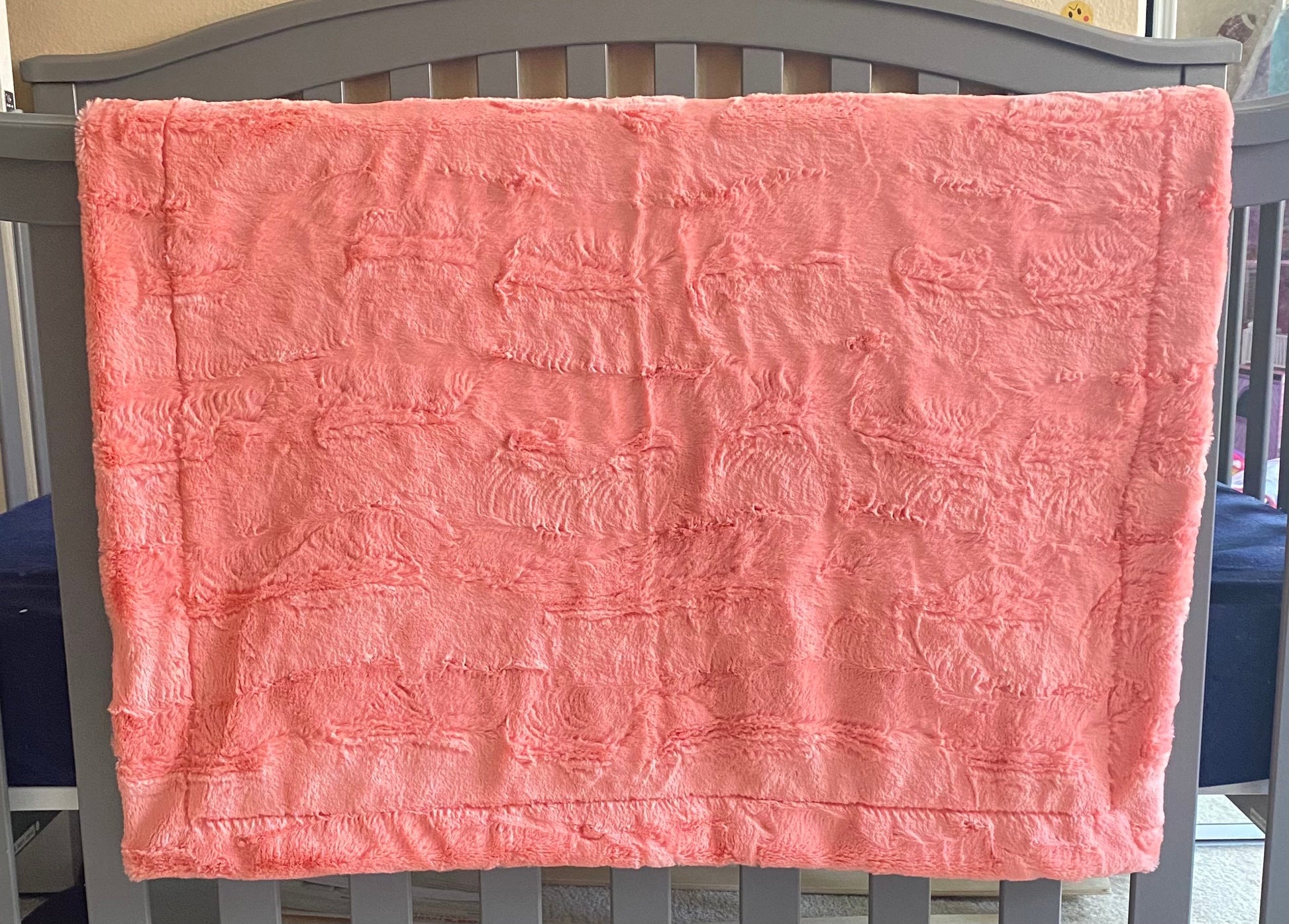 This hand made baby blanket has a beautiful floral pattern (minky) print with a papaya color luxe minky in the back this item is 30”x36” approx.