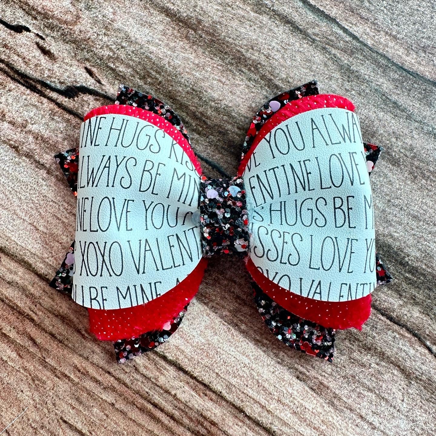 This wonderful hair bow is made out of glitter vegan leather, red sparkling velvet and vegan leather.
