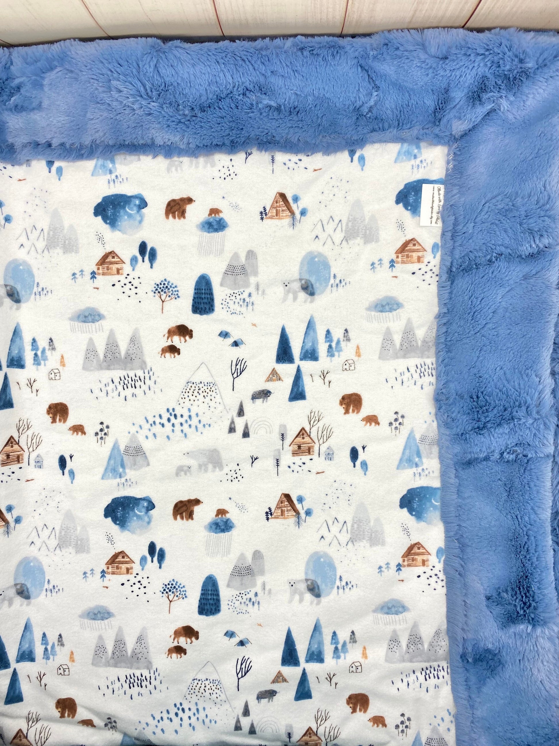 This hand made baby blanket has a beautiful bear and cabin (flannel) print with a denim color luxe cuddle minky in the back this item is 30”x36” approx.