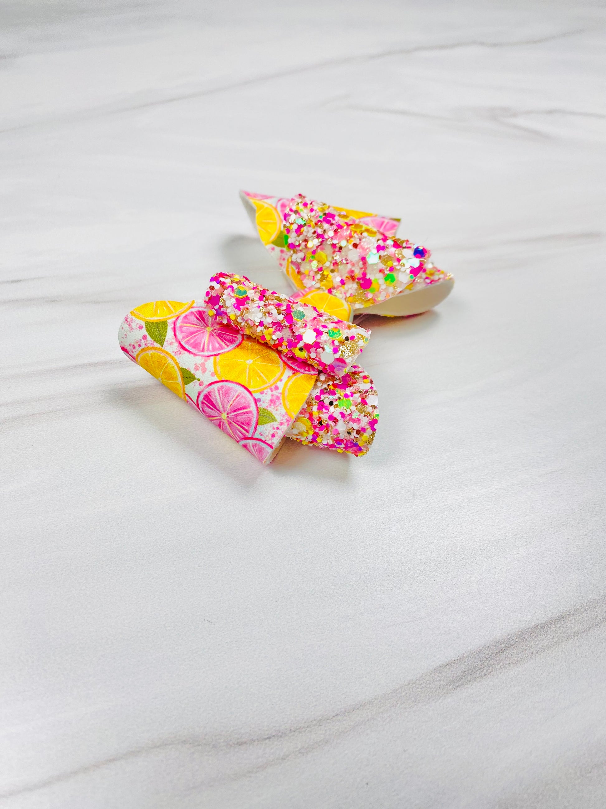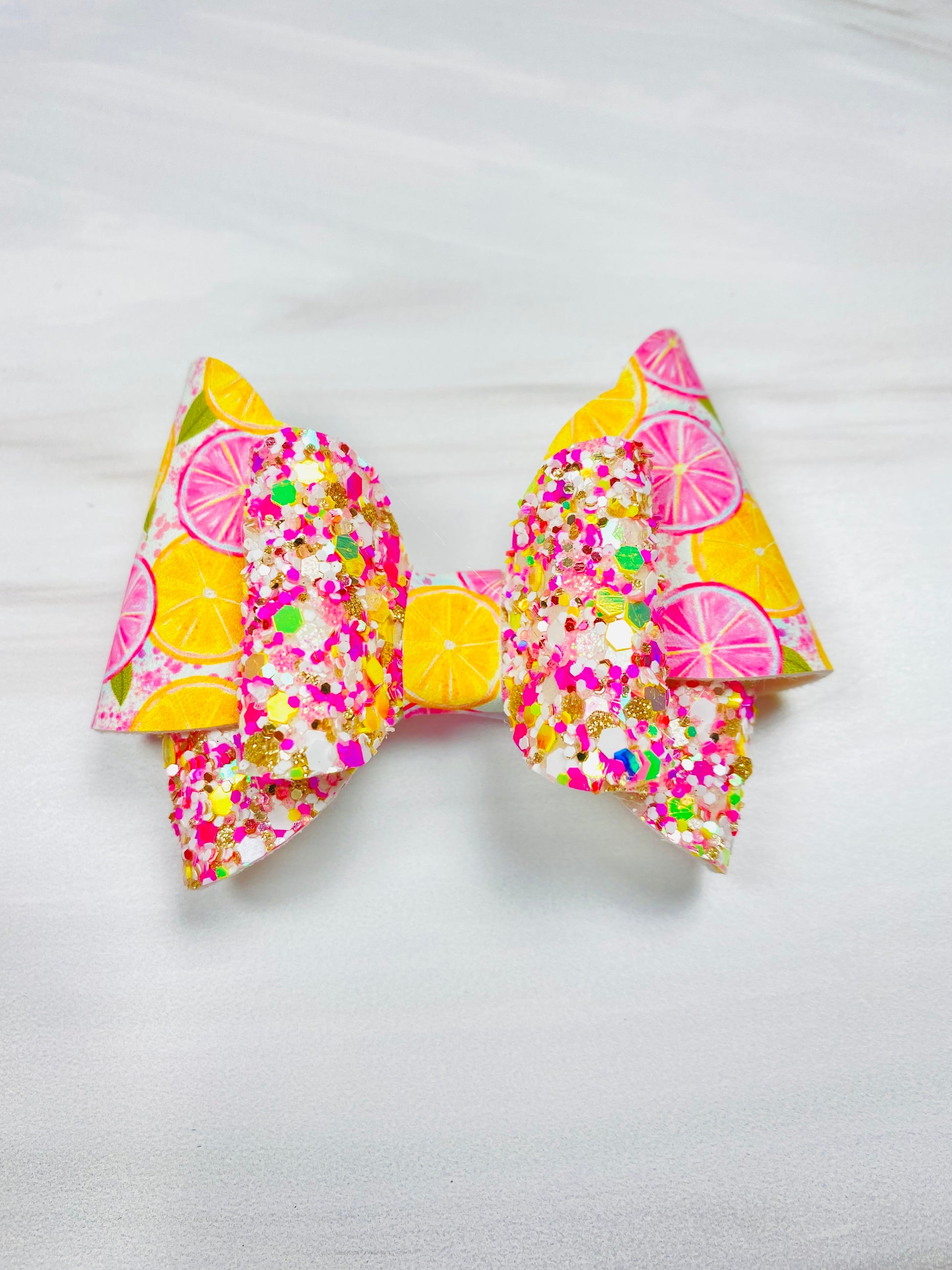 This hand made hair bow is made out of vegan leather and luxe glitter leather. This bow size is 3” wide. It is made from vegan leather and luxe glitter. All our hair bows have Alligator clip.