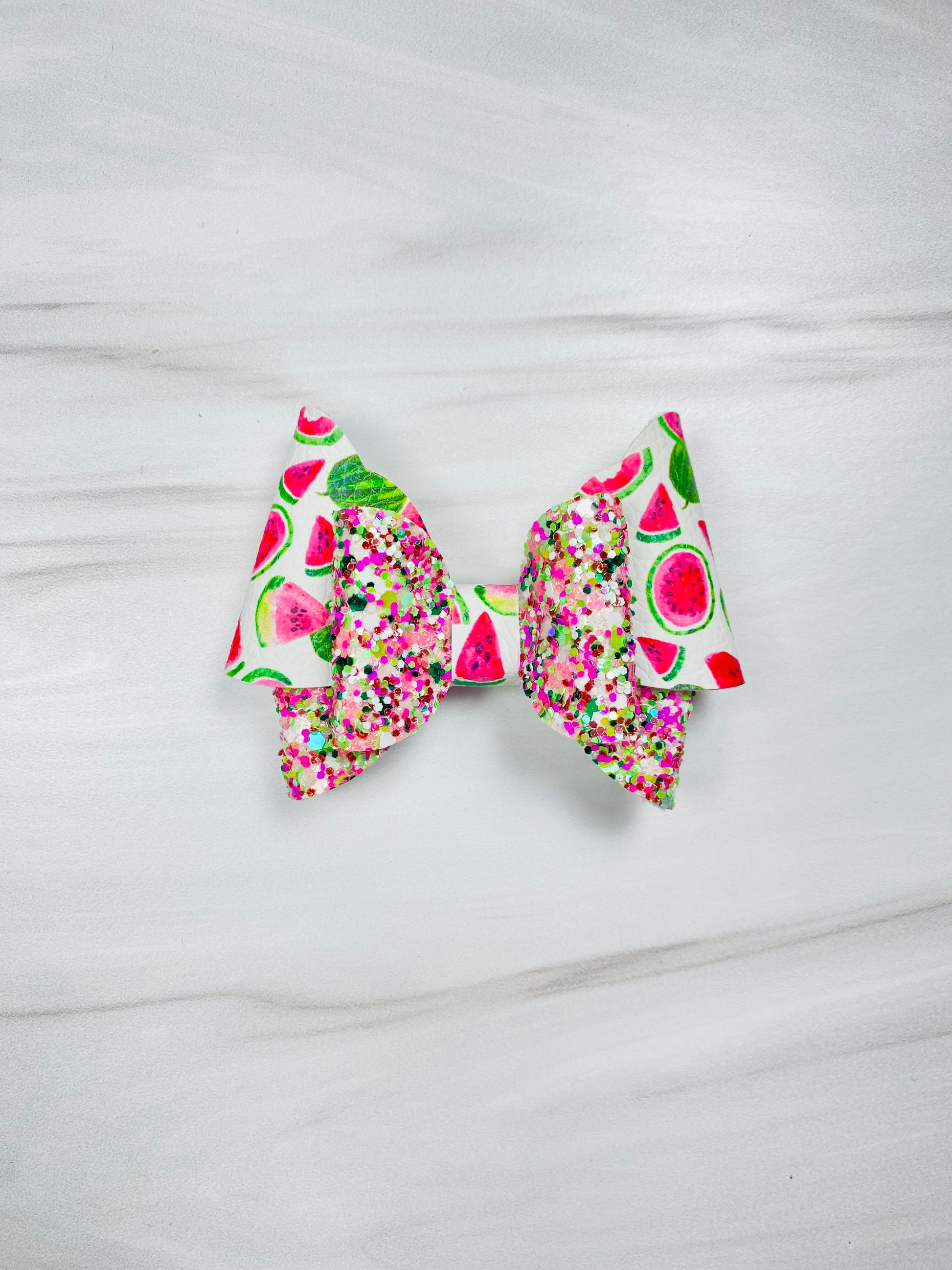 This hand made hair bow is made out of vegan leather and luxe glitter leather. This bow size is 3” wide. It is made from vegan leather and luxe glitter. All our hair bows have Alligator clip.