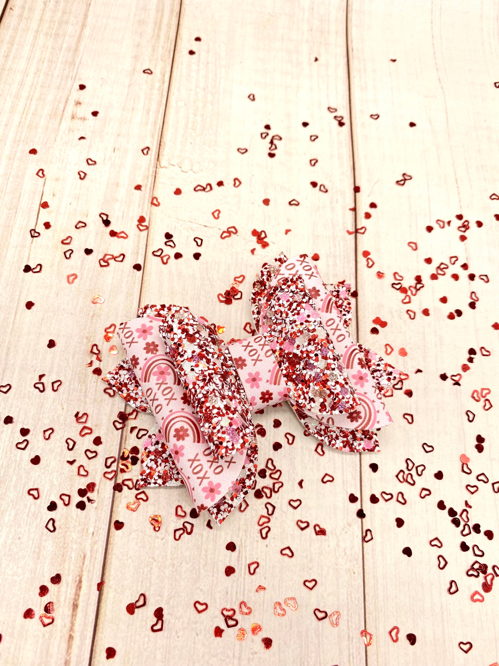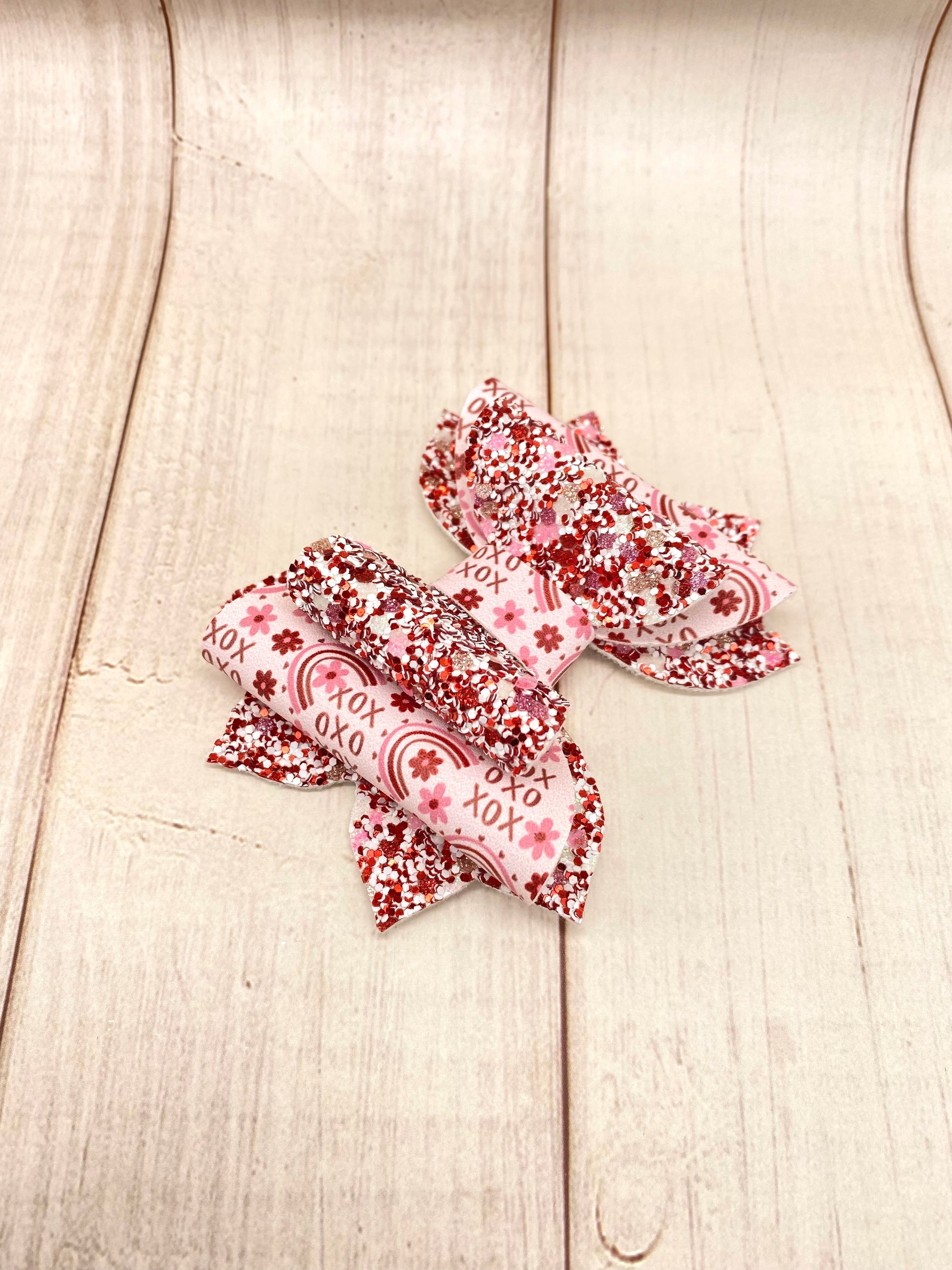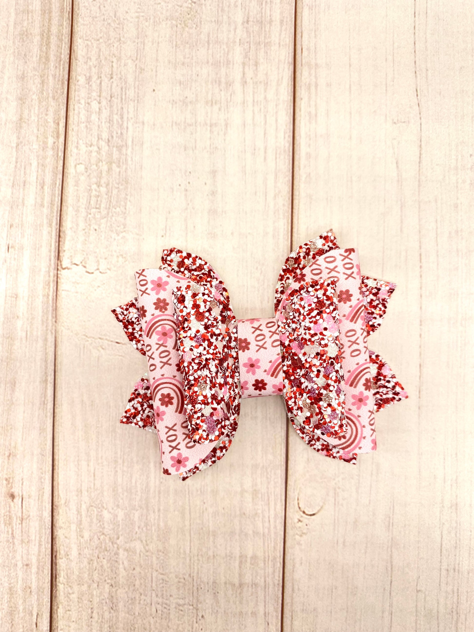 This hand made hair bow is made out of vegan leather and luxe glitter leather. This bow size is 3.5” wide. It is made from vegan leather and luxe glitter. All our hair bows have Alligator clip.