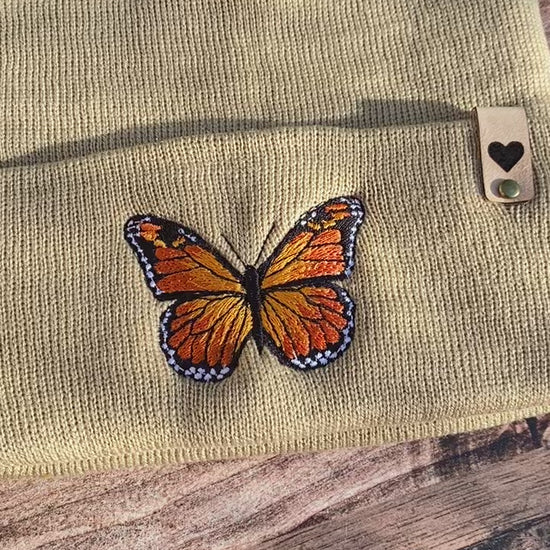 This embroidered monarch butterfly  beanie is perfect for the winter. Comfortable and soft to touch.