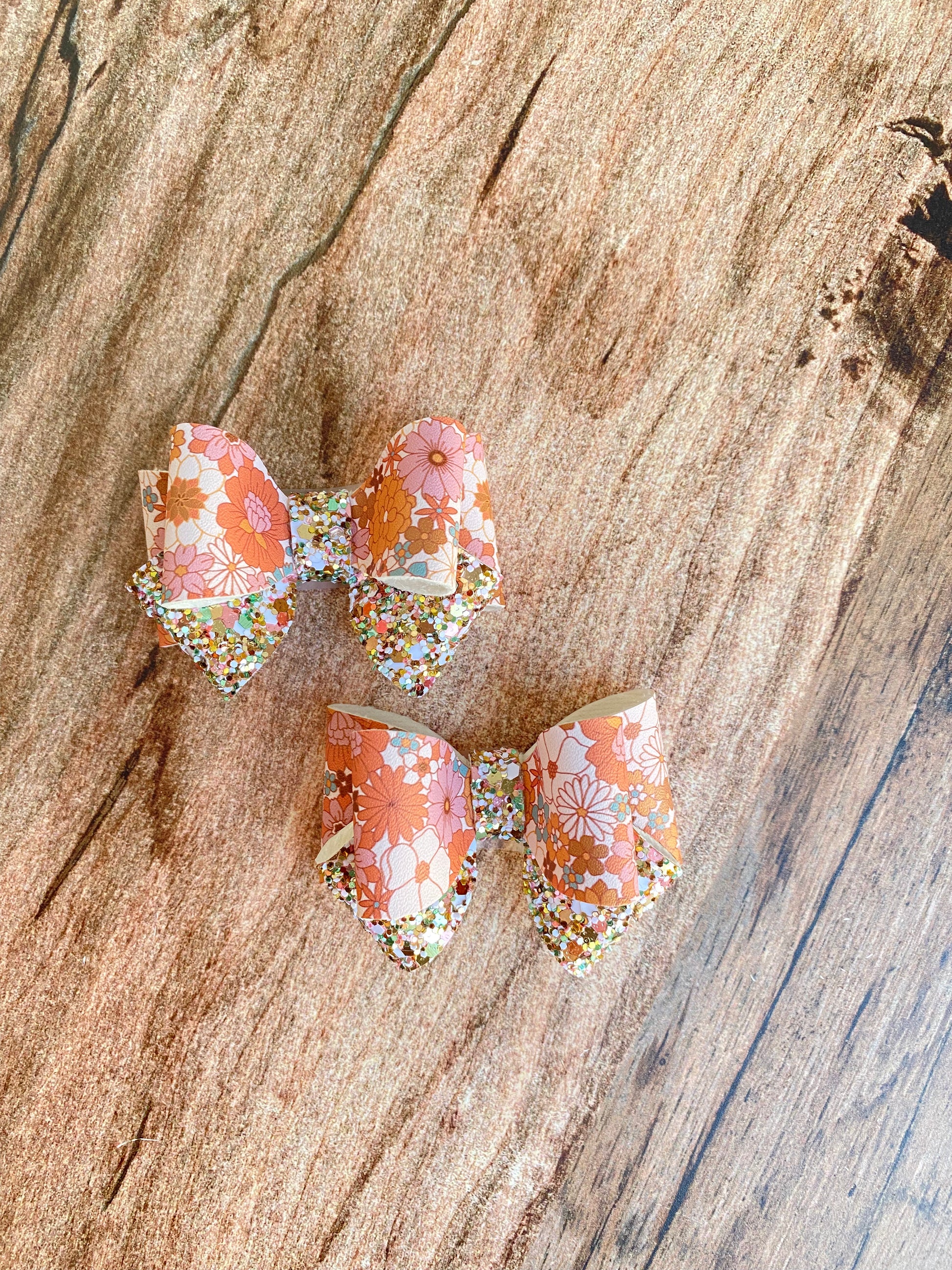 This hand made hair bow is made out of vegan leather and luxe glitter. This bow size is 2.5” wide.