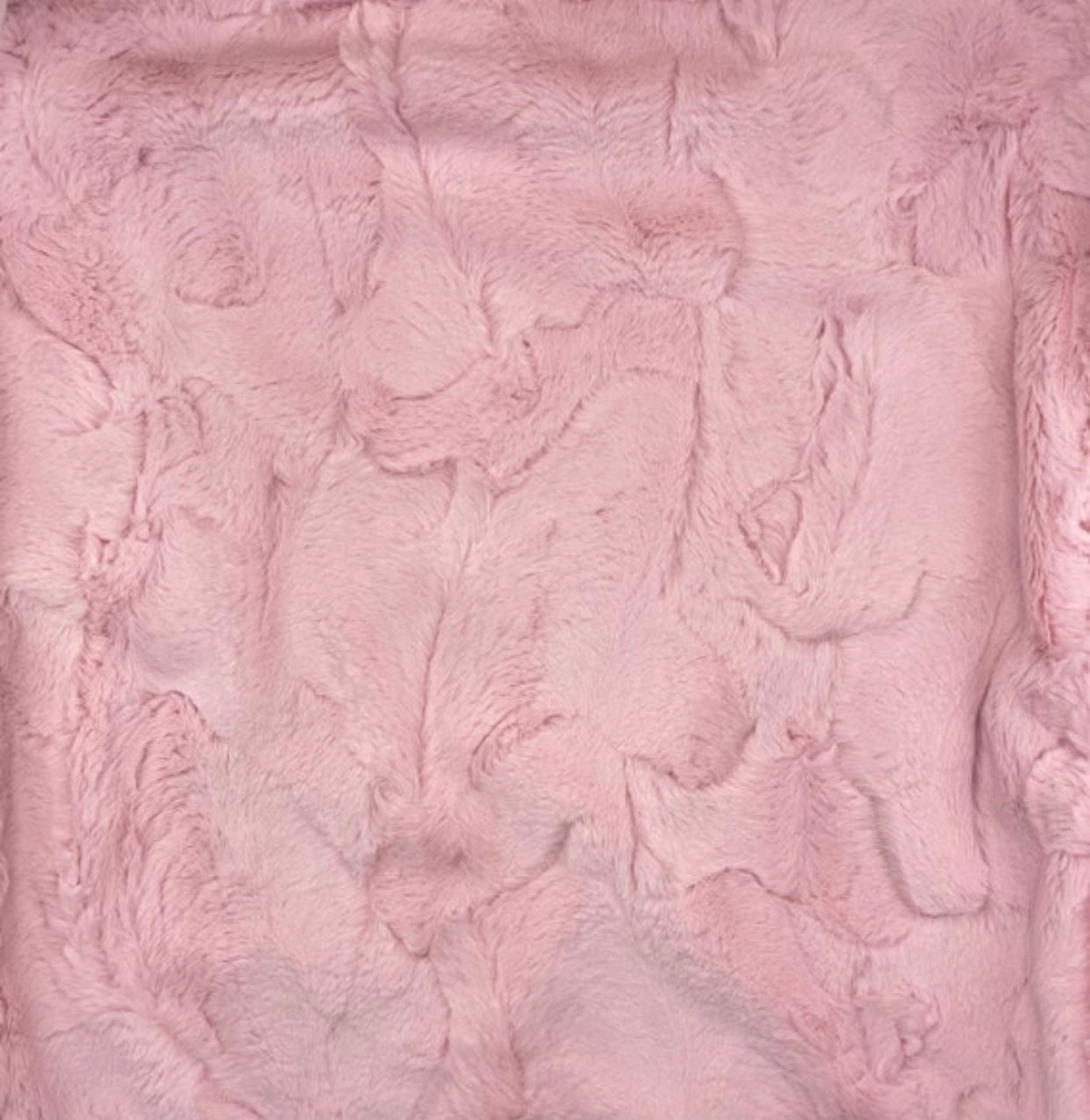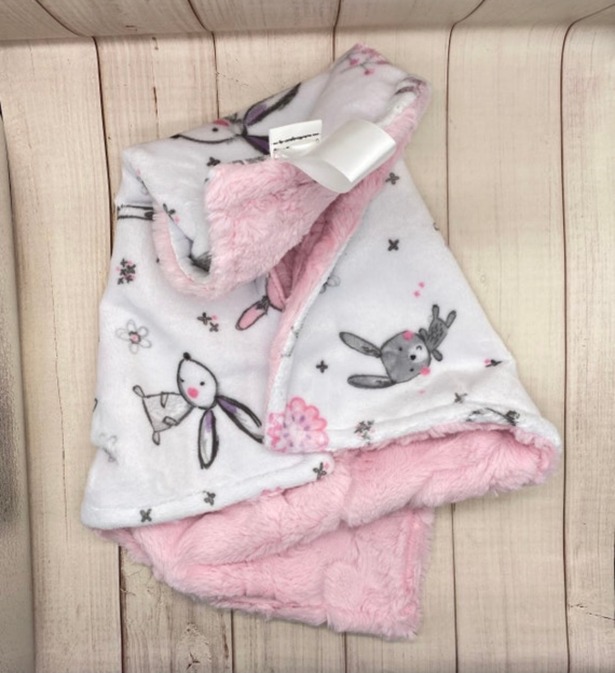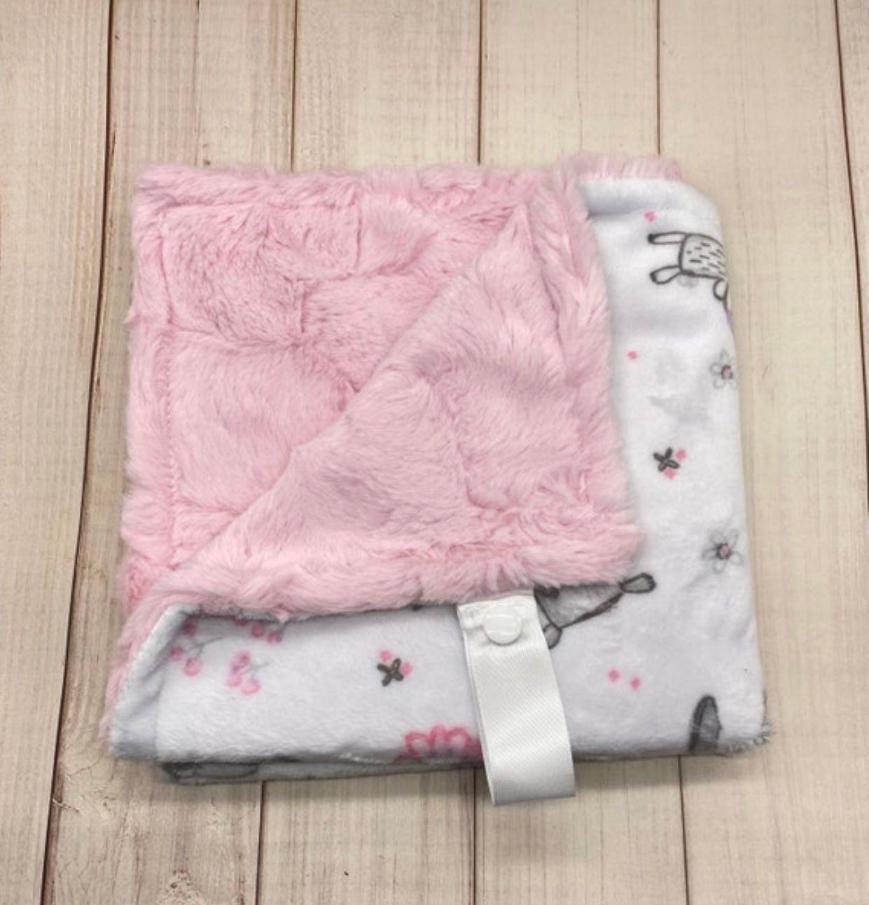 This hand made baby lovey has a beautiful in y and bunny/floral (minky) print with a blush color luxe minky in the back this item is 16”x16” approx. The minky fabric 100% polyester. It’s super soft and gentle with the skin.