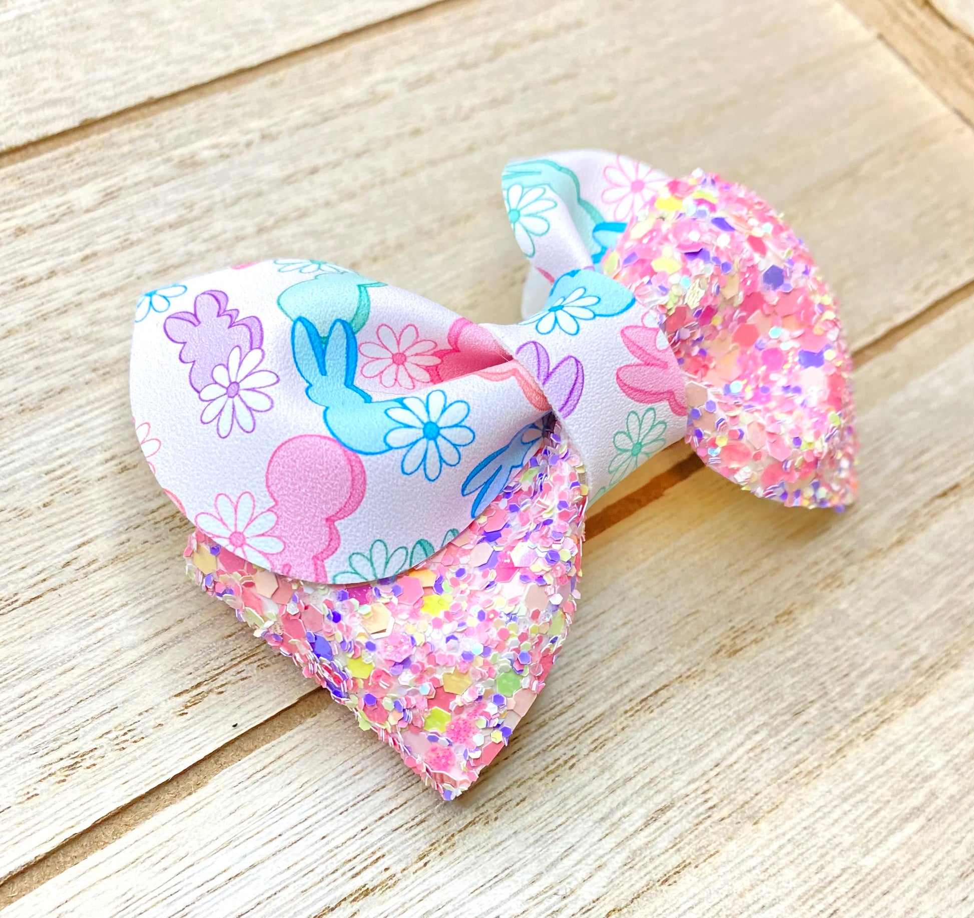 This hand made hair bow is made out of vegan leather and luxe glitter leather. This bow size is 3.5” wide. It is made from vegan leather and luxe glitter. All our hair bows have Alligator clip.