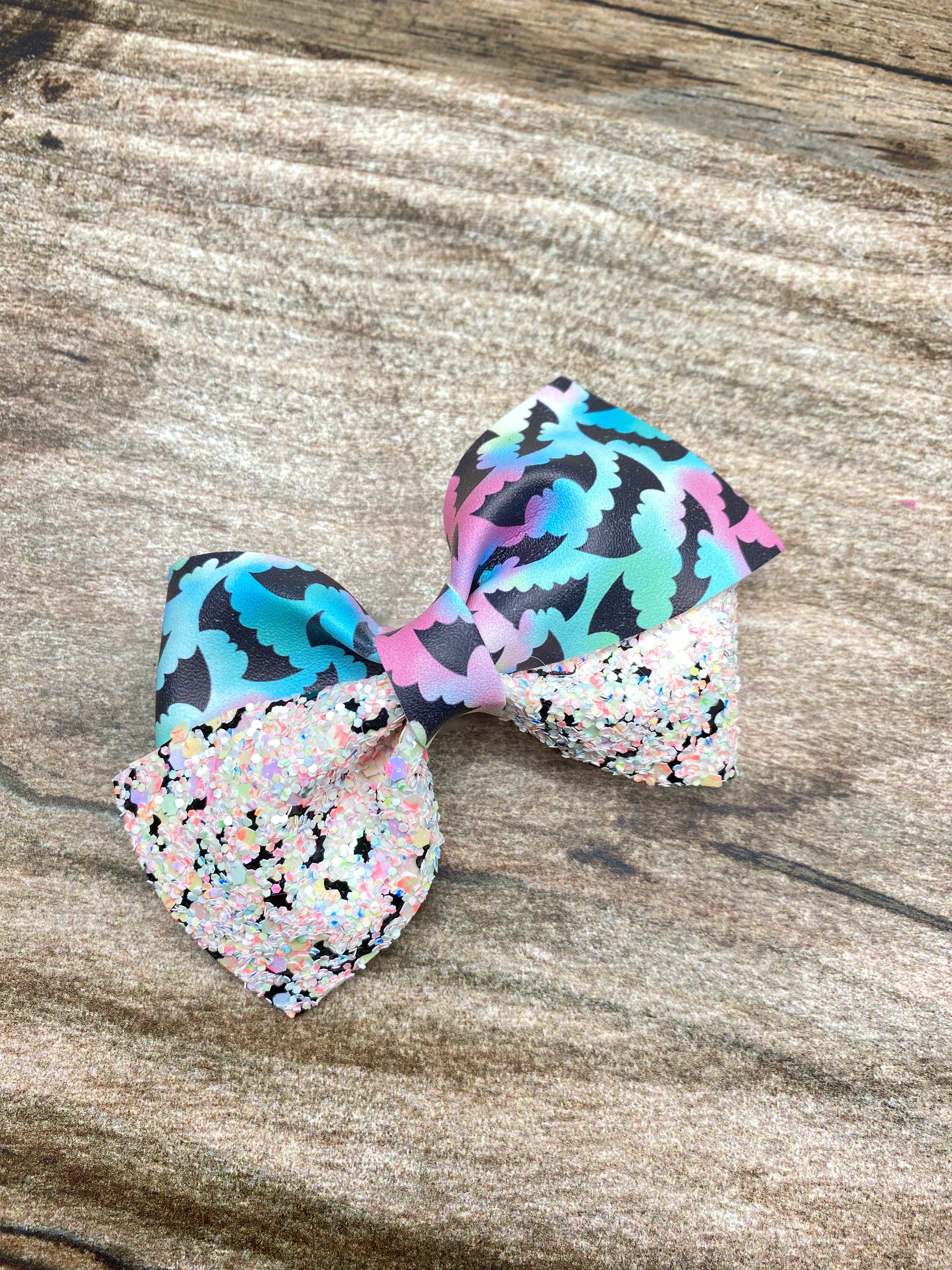 This hand made hair bow is made out of vegan leathe and luxe glitter. This bow size is 3.5” wide.