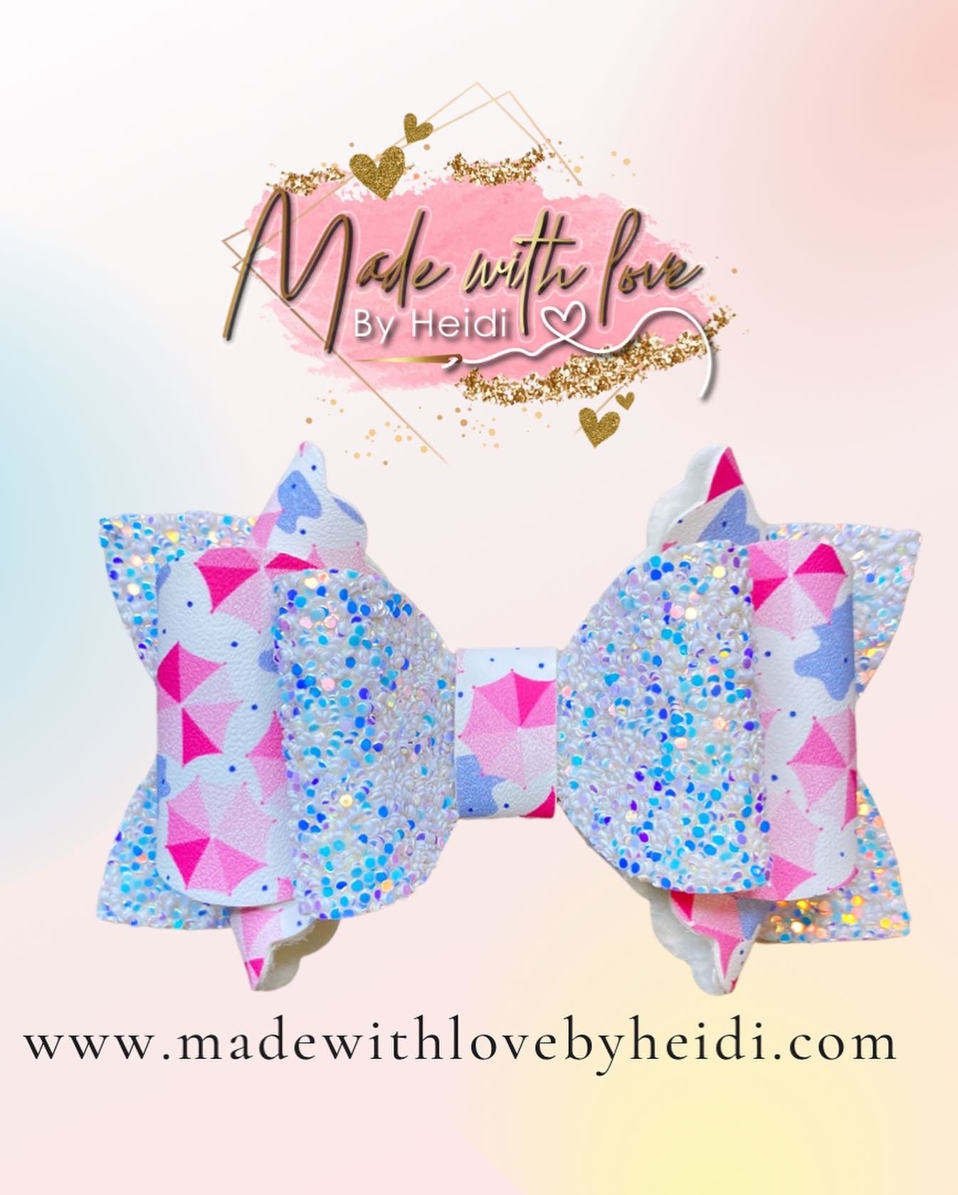This hand made hair bow is made out of vegan leather and luxe glitter leather. This bow size is 3.5” wide.