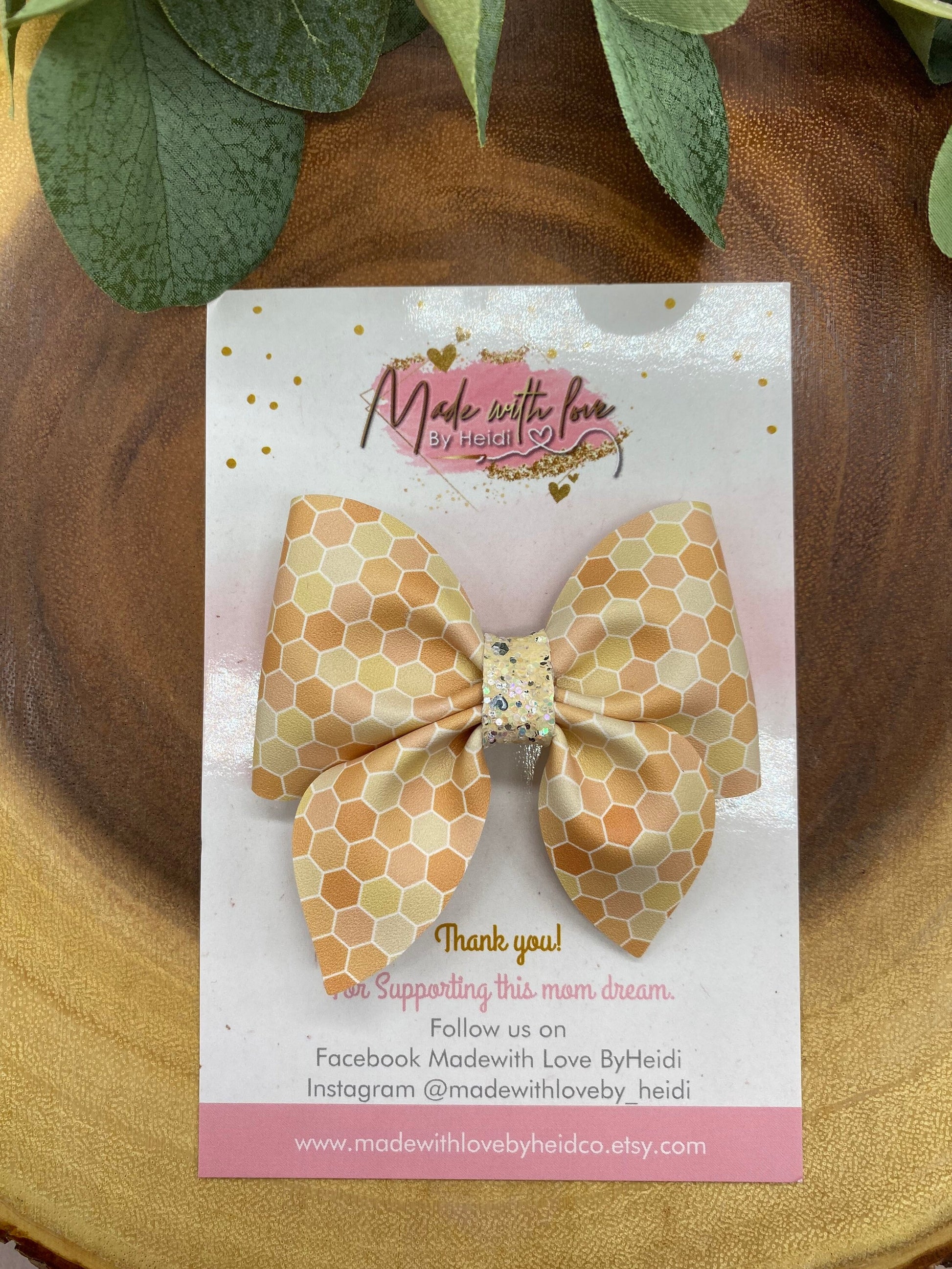 This hand made hair bow is made out of vegan leather and luxe glitter leather.